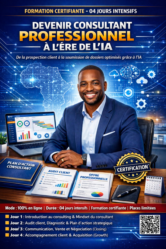 Formations, coaching et conseil premium pour les dirigeants et professionnels qui transforment l'Afrique. Résultats mesurables. Impact réel.